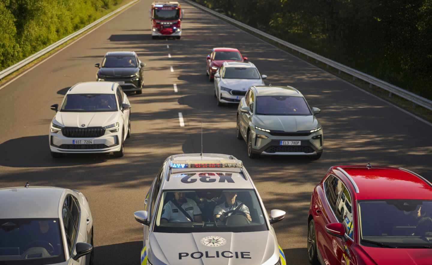Emergency vehicles with activated warning lights share location and direction via Safety Cloud®, which relays the data to the Škoda backend. If a subscribed Škoda vehicle is on the route, the driver receives an in-car alert with distance/direction and guidance to form an emergency corridor.