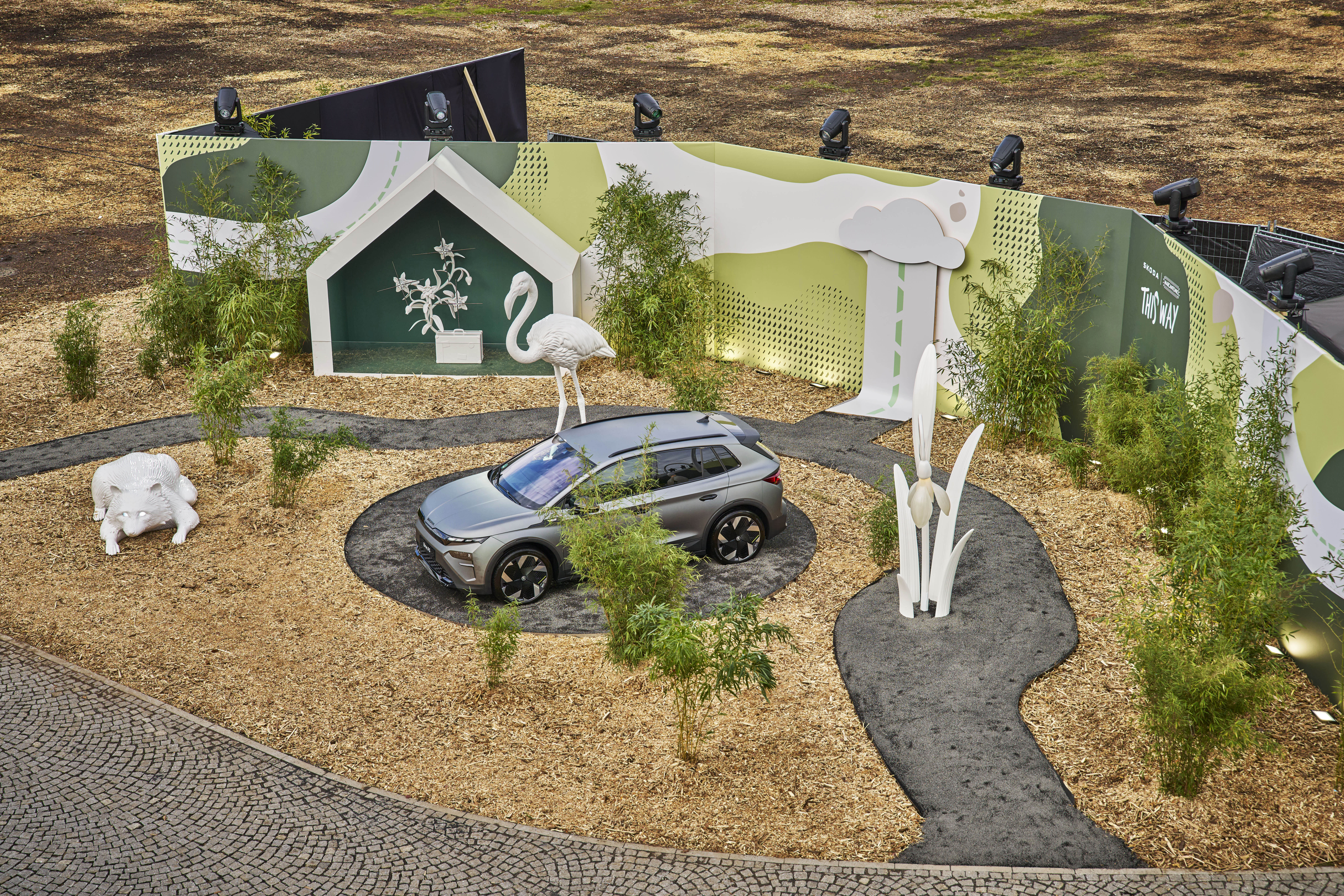 Přírodní motivy podtrhly přínos elektromobility pro čisté ovzduší, instalace nabrala na působivosti i díky matně šedé barvě, která je exkluzivitou limitované edice RS 130. Elroq má v současné modelové nabídce značky Škoda zvláštní postavení. Jde o první model navržený plně v duchu designového jazyka Modern Solid, vyjadřujícího zaměření na smysluplné inovace, udržitelnost a aktivní životní styl.