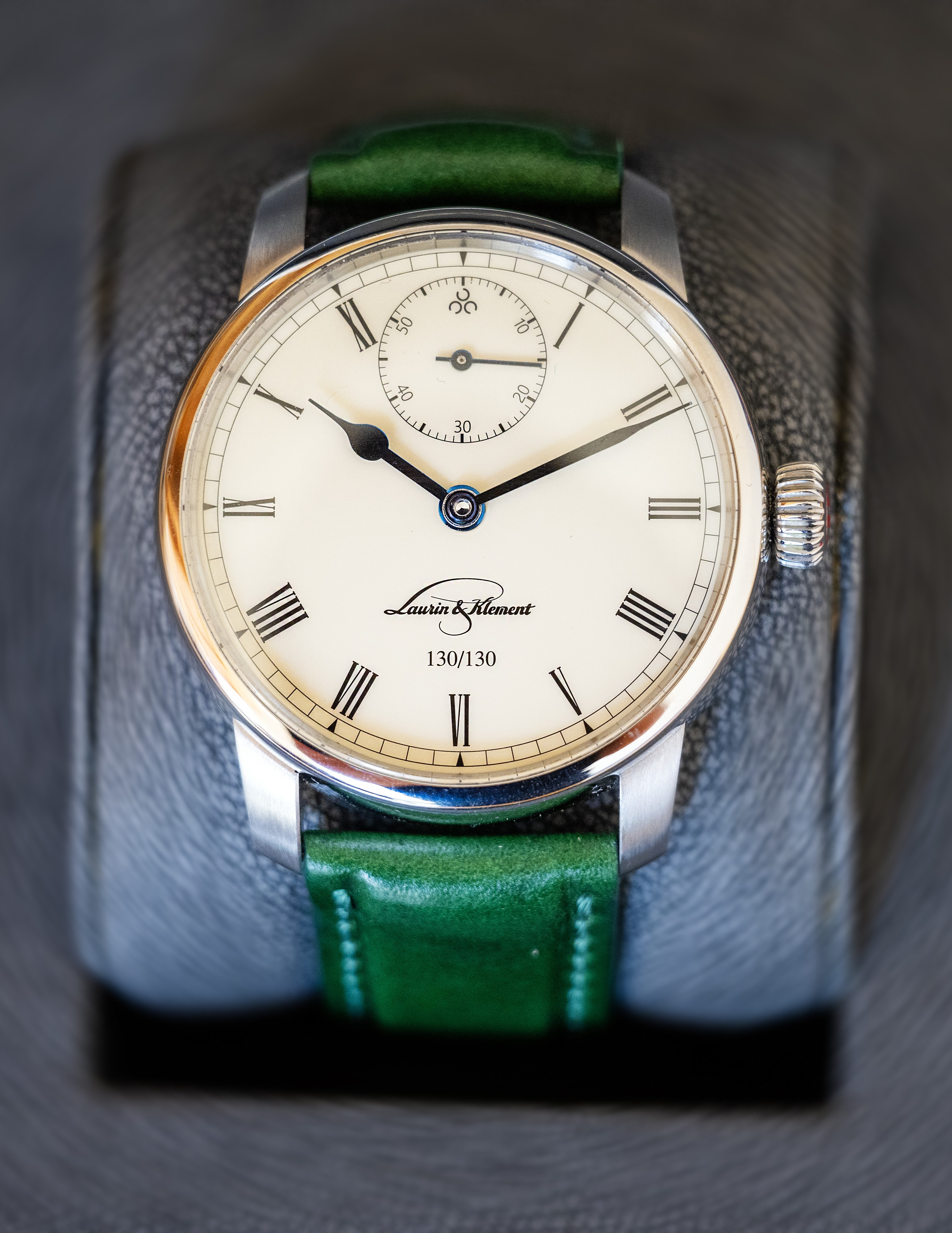 Z palubních hodin tohoto vozu byla převzata pozice mimostředné sekundové ručičky pod 12. hodinou. Tato konfigurace je dnes výjimečná, ale dříve se takto umístěné sekundové ručičky používaly u prvních chronometrů, etalonů přesného času. Dalšími díly, které našly inspiraci v kapesních hodinkách integrovaných do palubní desky, jsou hlavní ručičky. Jejich tvar, materiál i technologie popouštění do tmavě modré barvy odpovídají tradičnímu hodinářskému řemeslu. Číselník hodinek je vyroben unikátní technologií Brosmalt, vyvinutou firmou Prokop & Brož. Pigmentace podkladu odpovídá vysoce leštěnému laku Pearl White, použitému na karoserii historického vozu. Každý číselník je ručně vyráběný unikát opatřený číslem hodinek v sérii. Na korunce je laserem vygravírován znak Laurin & Klement, stejný, jaký zdobí chladič historického vozu, který byl inspirací pro tuto exkluzivní sérii hodinek. Ani tato specialita samozřejmě nemohla na Designbloku chybět.