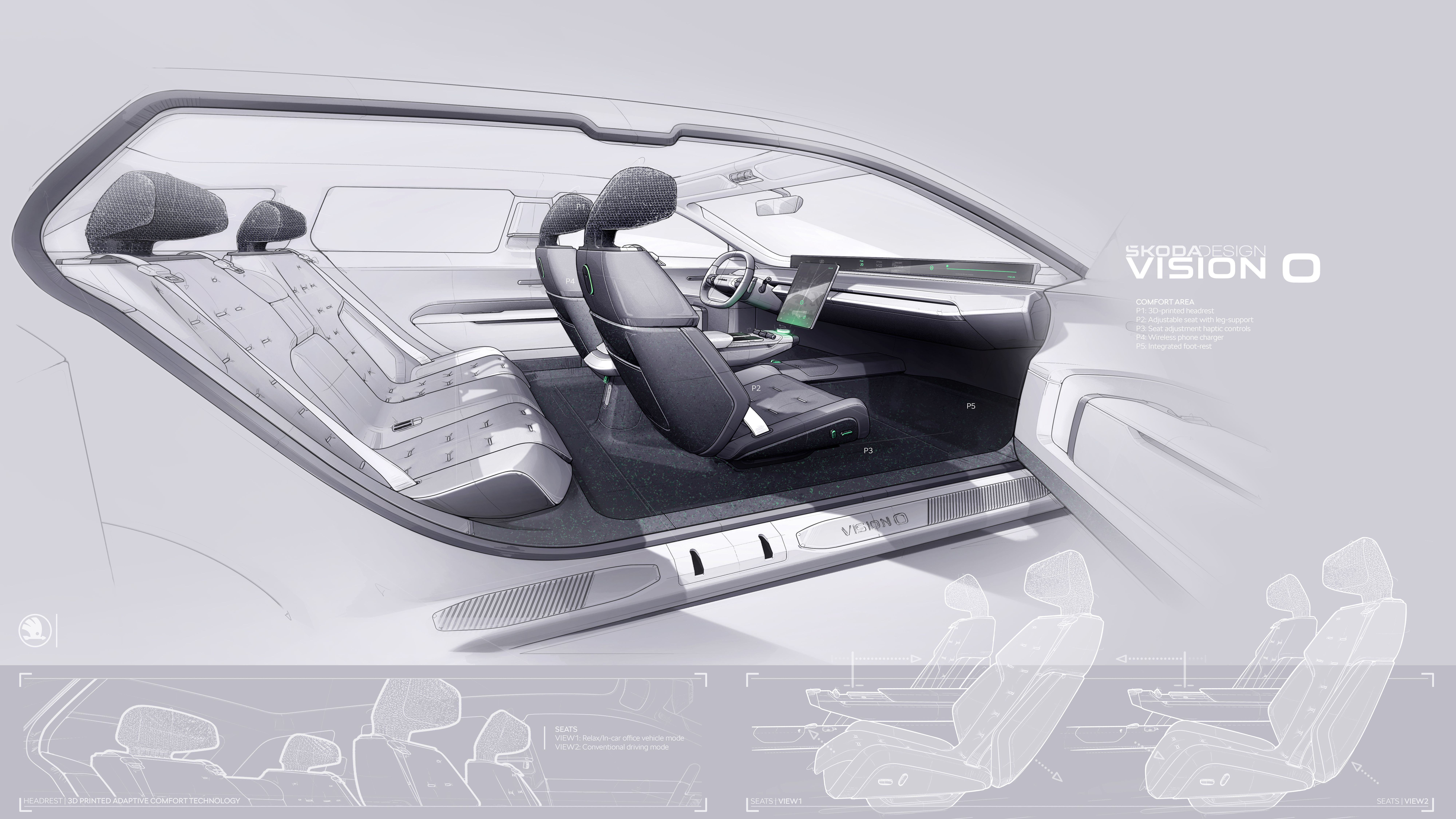 The seat materials used for the Vision O were tailor-made to fit its unique seat shape. Škoda Auto's design department created the material as a flat knit with different structures knitted into a single piece. This design ensures an optimal fit, enhances durability, and fully supports a range of seating configurations. The circular aspects include the use of 100% recycled polyester (rec PES) and a mono-material approach.