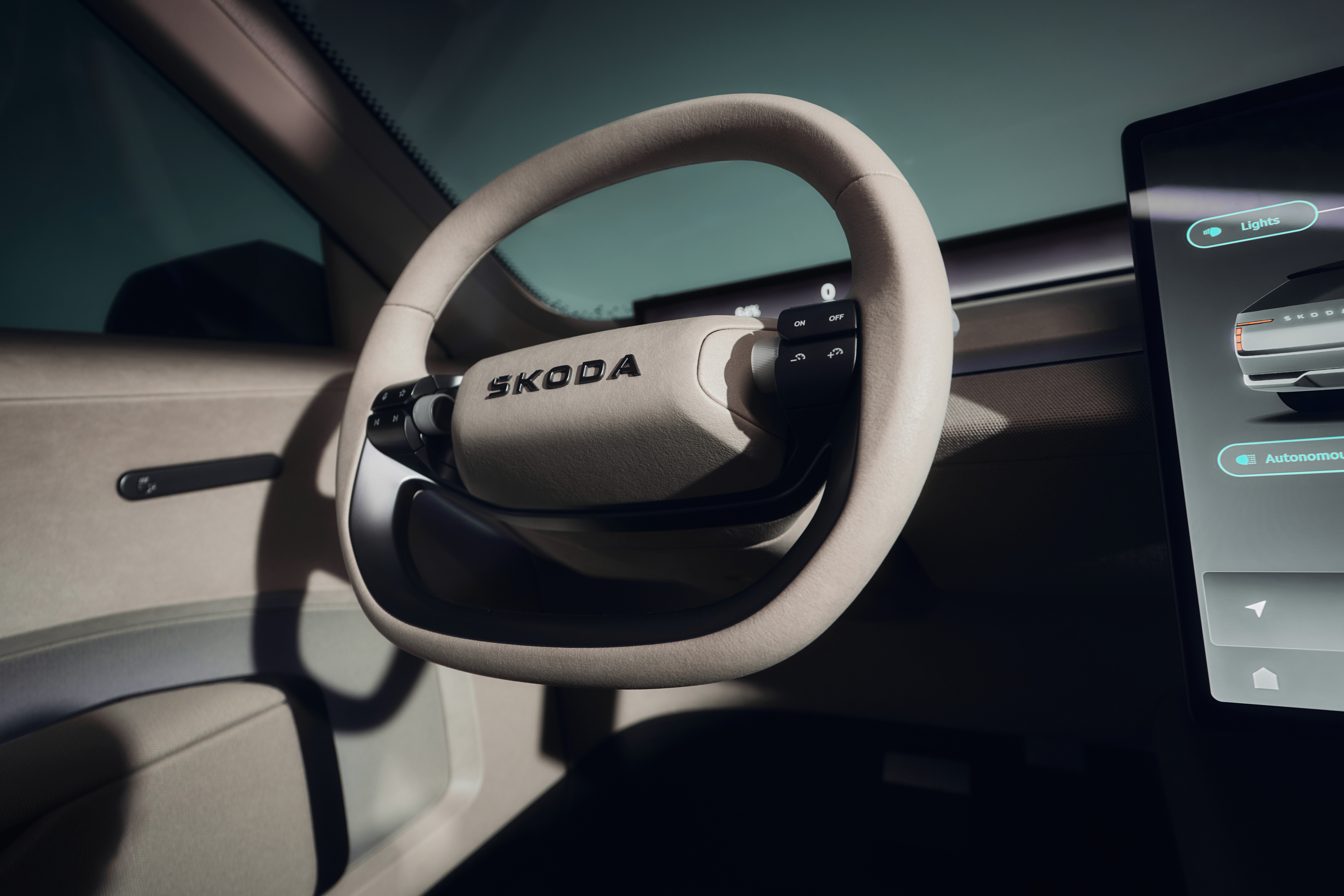 The monochromatic aesthetics emphasize the cockpit layout and act as a framework for interacting with the car, ensuring clarity and ease of use. Key interior highlights include a Škoda Horizon Display, offering optimal visibility and intuitively steerable interaction. The new Škoda Bio-Adaptive Lighting adjusts the cabin's shades according to natural light cycles, supporting human biorhythms and creating a powerful, human-centred experience. Combined with the interior's inviting achromatic colour scheme, it creates a relaxing environment that seamlessly frames the user's interaction with the HMI system. The nearly achromatic colour concept features darker taupe front seats for natural asymmetry, aligning with the Bio-adaptive illumination and digital screen colours for a serene yet bold statement of simplicity.
