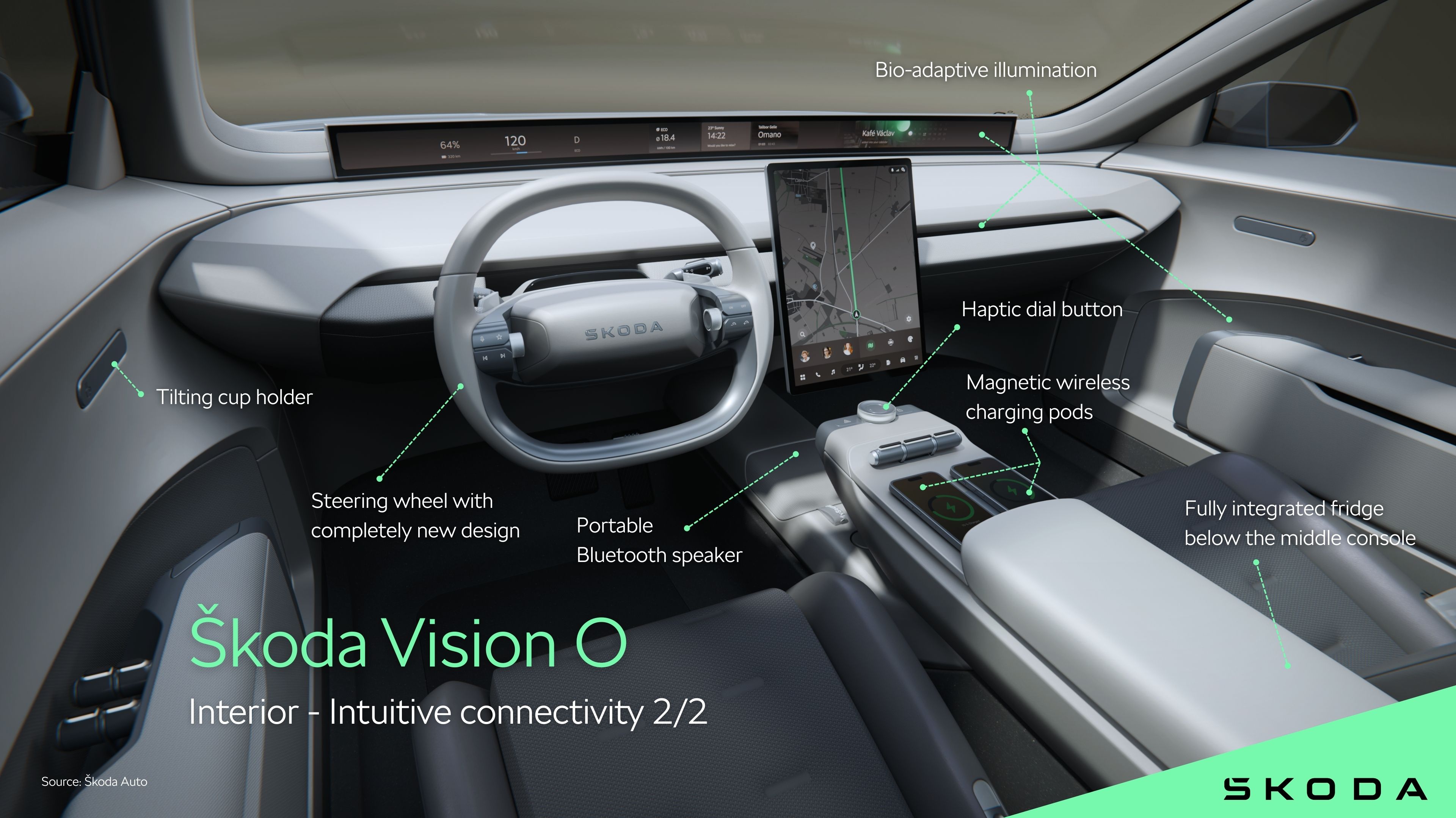 › Material and colour concept supports the evolution of the brand’s design language with achromatic aesthetics and features the new Škoda Bio-Adaptive Lighting