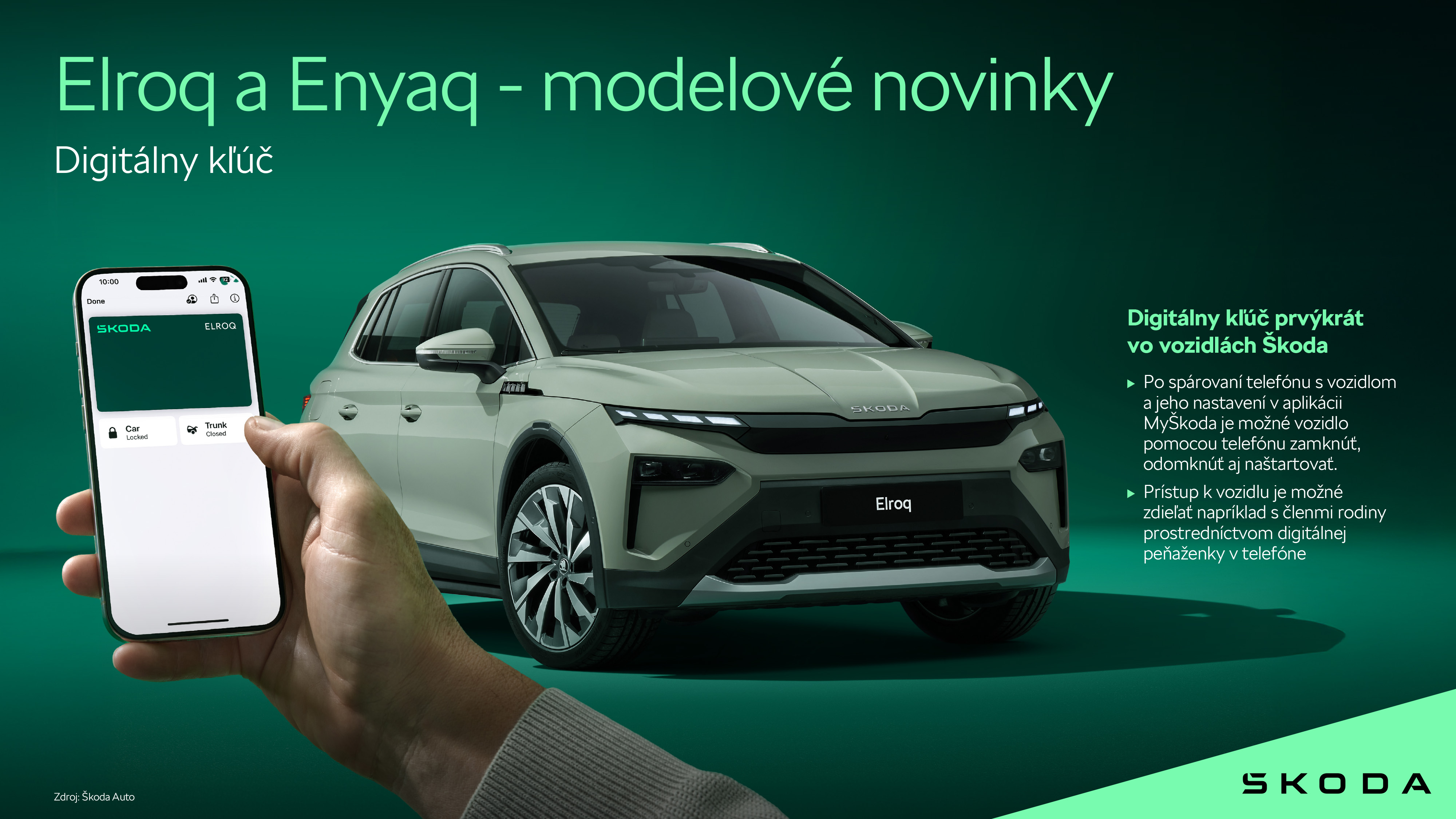 Vozidlá Škoda budú po prvý raz vybavené funkciou digitálneho kľúča2. Po spárovaní telefónu s vozidlom a jeho nastavení v aplikácii MyŠkoda môžu používatelia vozidlo pomocou smartfónu zamknúť, odomknúť aj naštartovať. Hneď ako je digitálny kľúč aktivovaný v aplikácii MyŠkoda, možno prístup k vozidlu zdieľať napríklad s členmi rodiny prostredníctvom digitálnej peňaženky v telefóne.