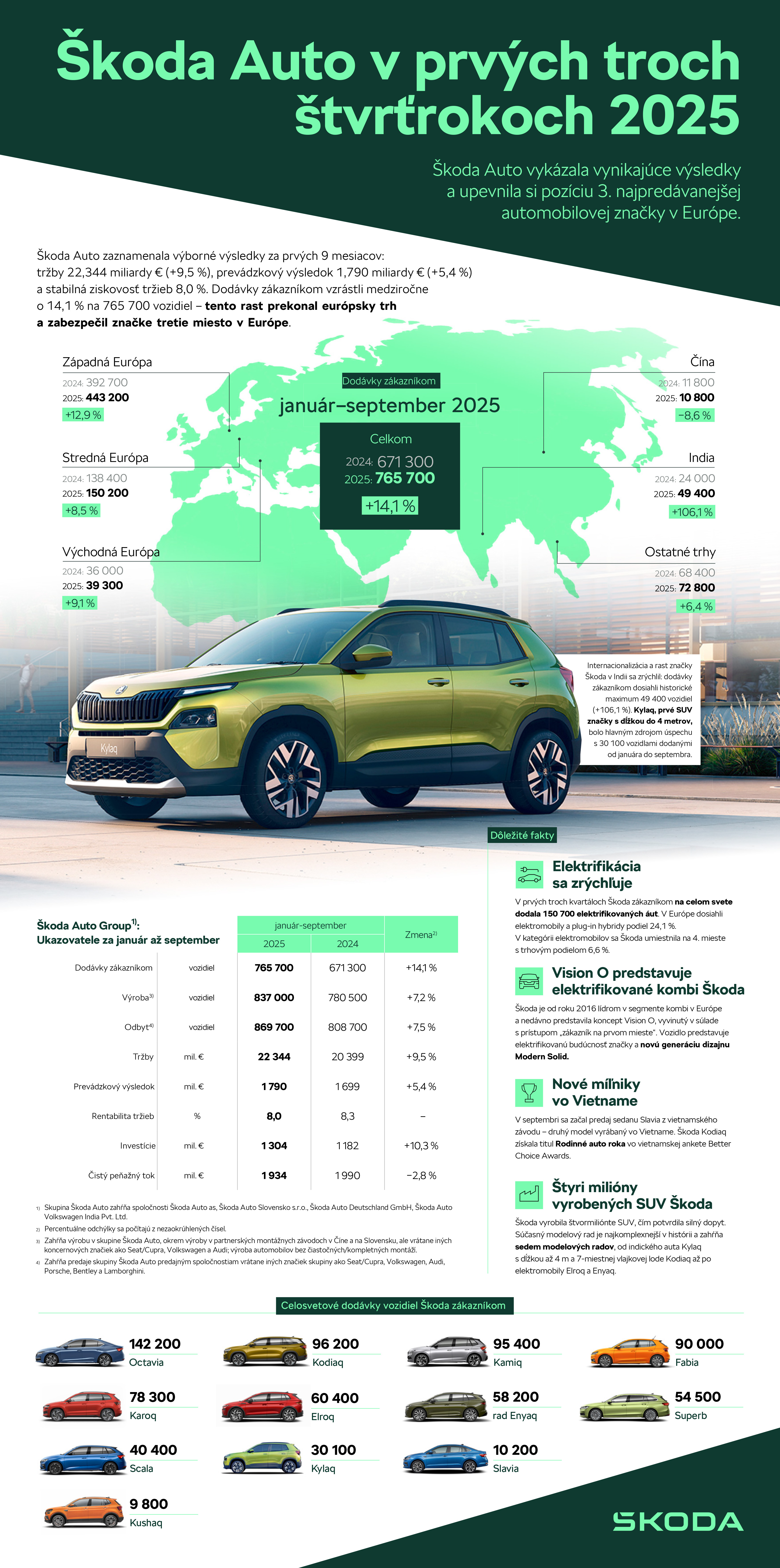 Bratislava, 31. októbra 2025 – Škoda Auto za prvé tri kvartály roku 2025 zaznamenala vynikajúce finančné výsledky: tržby vzrástli na 22,344 mld. eur (+9,5 %), prevádzkový zisk sa zvýšil na 1,790 mld. eur (+5,4 %) a čistý peňažný tok zostal na veľmi dobrej úrovni 1,934 mld. eur (−2,8 %). Solídna je aj rentabilita tržieb vo výške 8,0 % (vlani: 8,3 %), ktorá potvrdzuje pozíciu značky Škoda medzi najziskovejšími objemovými značkami v Európe. Zákazníkom po celom svete bolo dodaných 765 700 vozidiel, čo predstavuje medziročný nárast o 14,1 %. V Európe (zahŕňa EÚ 27, Spojené kráľovstvo, Švajčiarsko, Nórsko a Island) značka dodala 616 300 vozidiel a obhájila svoju 3. pozíciu. Podiel plne elektrických (BEV) a plug-in hybridných vozidiel (PHEV) tvorí v tomto regióne už 24,1 % dodávok (pred rokom: 11,1 %), pričom modely Elroq a Enyaq sú tu na 3. a 6. mieste medzi elektromobilmi. Elroq navyše prekročil hranicu 100 000 objednávok od začiatku predaja. V plnom prúde je aj internacionalizácia značky – v Indii Škoda dosiahla historické maximum so 49 400 dodanými vozidlami (+106,1 %) a vo Vietname bola počas roka spustená výroba modelu Kushaq, pričom od septembra sa tam vyrába aj predáva sedan Slavia.